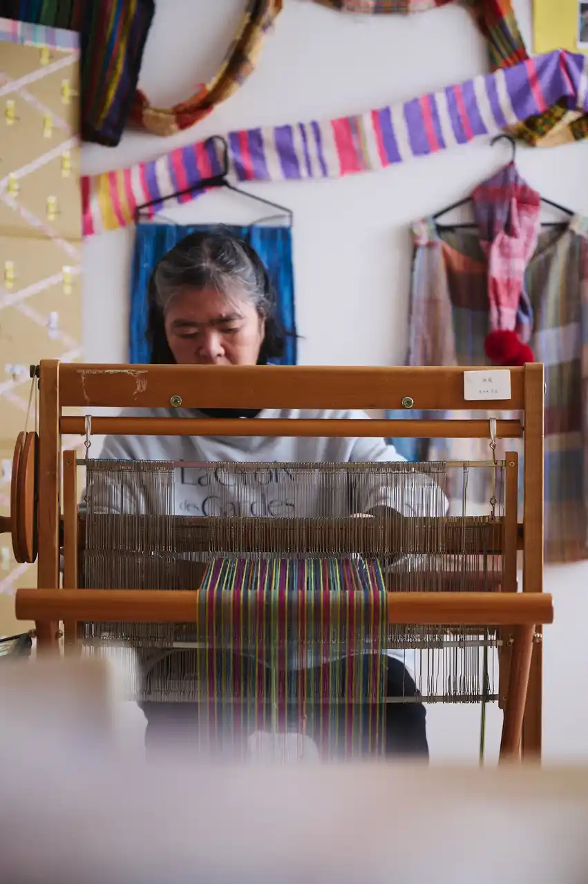 制作中の彼女は、ほとんど言葉を発さない。織り機に向かい、完成を急ぐことなく、思いのままに手を動かし続ける。糸を選び、装着し、踏みながら動かす。その時間の積み重ねによって、布は少しずつ表情を帯びていく。さをり織りという自由度の高い織りだからこそ、判断にとらわれず、感覚に委ねることのできる制作のあり方が読み取れる。黙々と動く手の中で、糸は層となり、重なり合う。その連なりから、彼女の日々が浮かび上がる。 |
