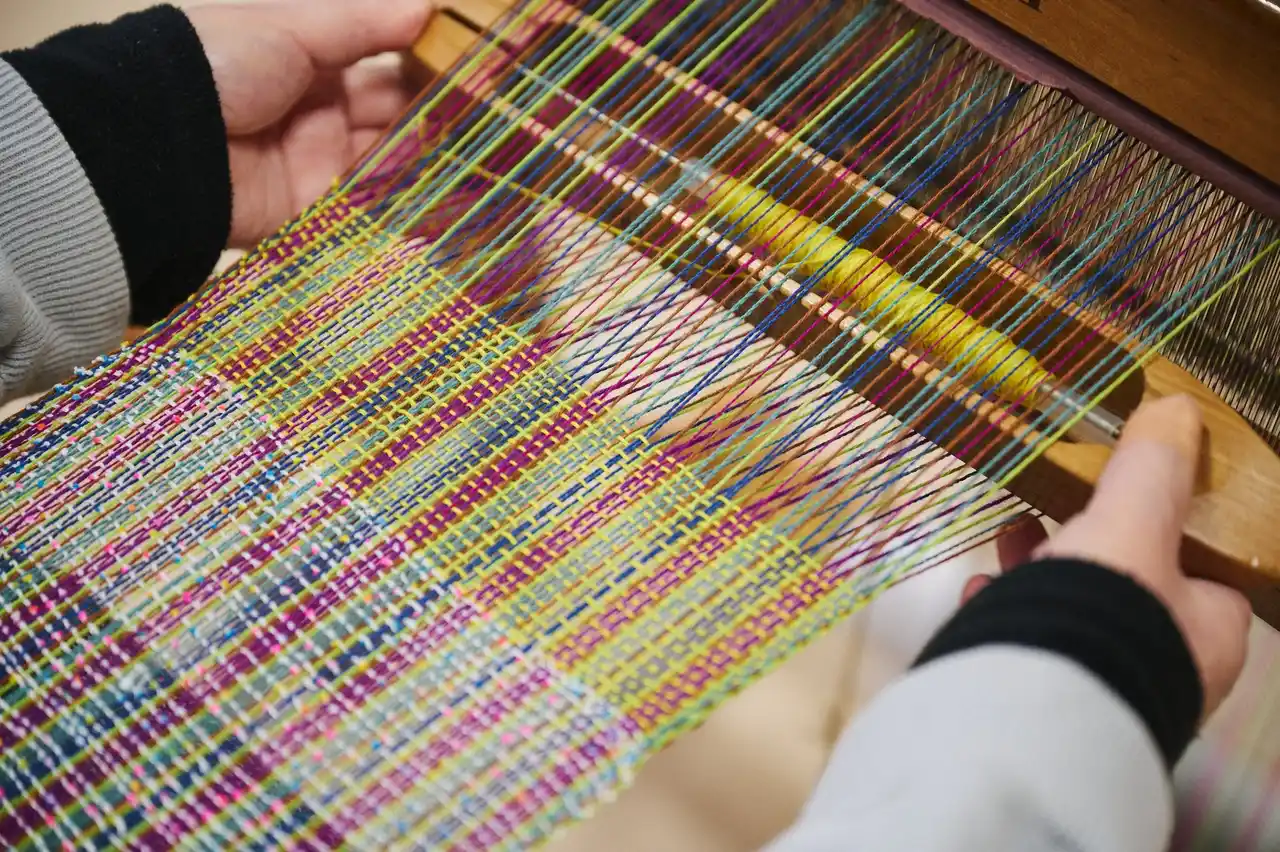 「さをり織り」とは、誰でも自由に織ることを大切にした日本発祥の手織りの技法です。一般的な織物のように均一で正確な状態を目指すのではなく、織り手それぞれの感性をそのまま布へと映し出すという思想のもと、織ムラや傷なども個性として捉えます。福祉施設で取り組まれることも多い織り表現です。 |