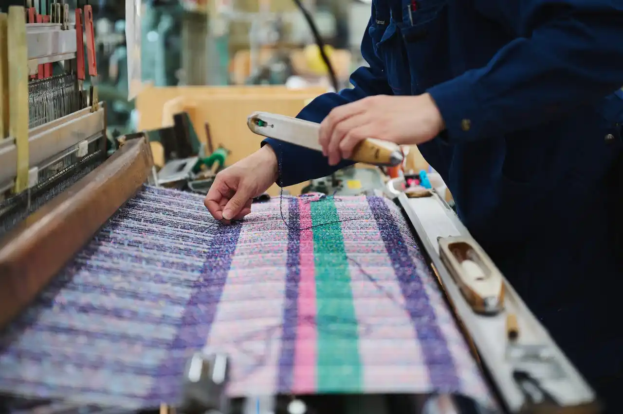 本プロジェクトは、ルンビニー苑の作家・良子氏がさをり織りで生み出した手織りテキスタイルデザインを元に、日本ホームスパンの職人が生地へと昇華し、ヘラルボニーがプロダクトとして届けるという試みです。制作にあたり、良子氏と日本ホームスパンの職人は互いの制作現場を行き来しながら制作を進めました。 |