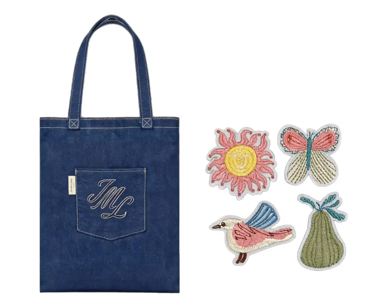 オリジナルのデニム トート バッグと刺繍パッチをプレゼント |