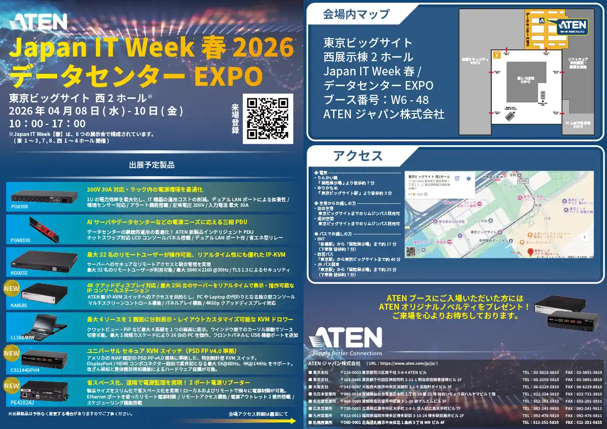 ATENジャパン株式会社(本社:東京都荒川区、取締役社長:鄧 鴻群[Hans Teng])は、2026年4月8日(水)~10日(金)に東京ビッグサイトで開催される IT総合展「Japan IT Week 春」内の「データセンターEXPO」に出展いたします。 |