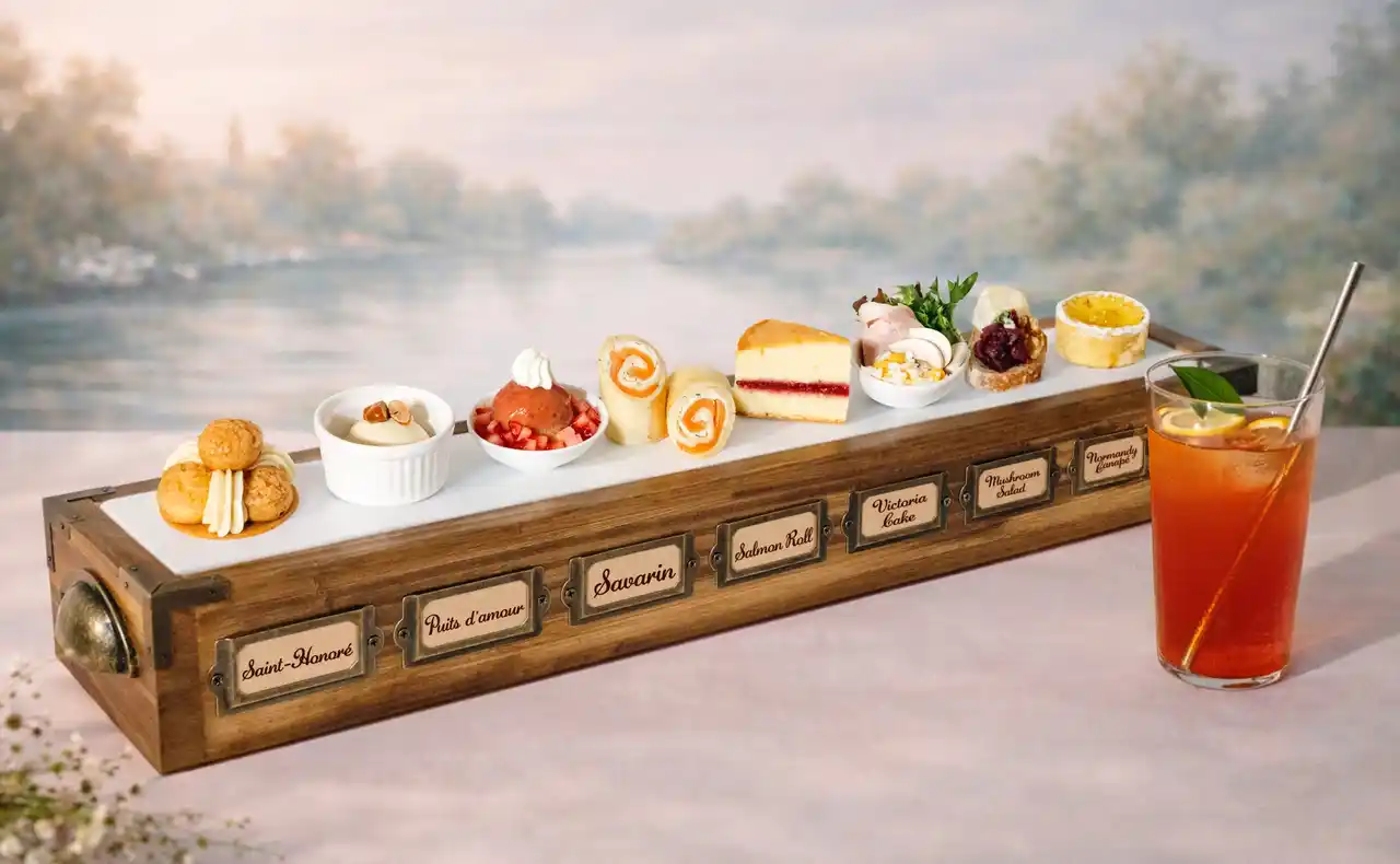 “光の画家”として知られる印象派の巨匠、クロード・モネ。刻一刻と表情を変える光や風の気配を、繊細な筆致と豊かな色彩でとらえた作品は、世界中で愛され続けています。中でも「舟遊び」は、穏やかな水面にきらめく光の粒、春の空気、人物の気配までもが溶け合うように描かれ、観る者の感覚を静かに揺さぶる一作です。本エキシビションは、モネの半生を辿る「8種のスイーツ&セイボリー」の前菜と、作品の世界観を立体的に表現した「メインプレート」の2部構成です。