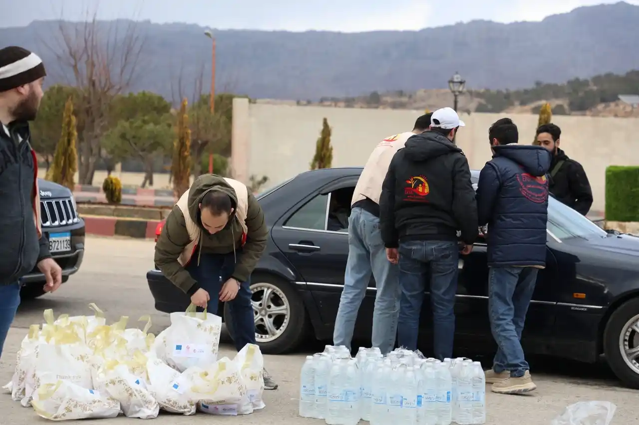 レバノンにおいて支援物資を配る様子 |