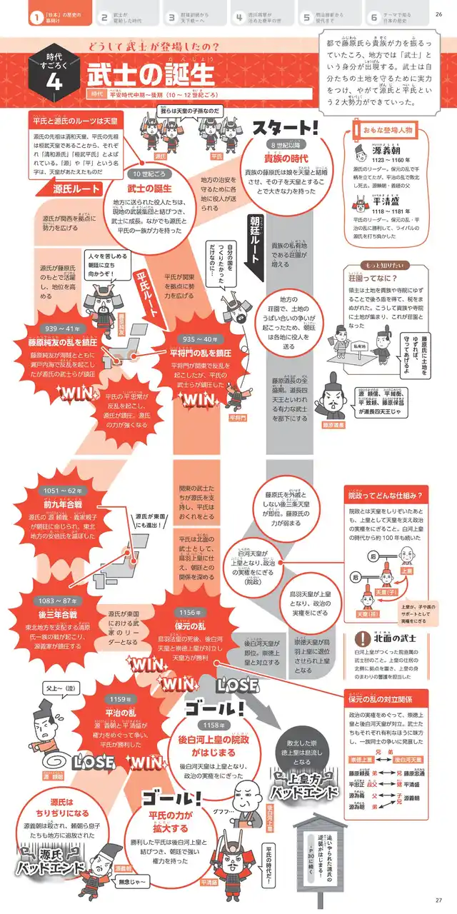 2.「点」が「線」になる、すごろく式ビジュアル 「源氏と平氏」「幕府と朝廷」など、従来のテキストでは理解が難しかった複数の勢力の動きを、すごろくのルートとして表現。合流・分岐・交錯を視覚化することで、歴史の流れがひと目でわかります。 |