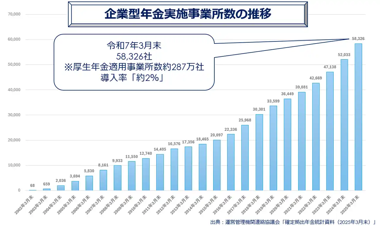 三大不安要素のうち「老後」を解決する企業型DCですが、厚生労働省が発表した確定拠出年金統計資料(運営管理機関連絡協議会 2025年3月末作成)において、実施事業所数が58,326社となっており、企業型DCの導入要件となる厚生年金適用事業所数約287万社に対し、導入率は約2%しかありません。 |