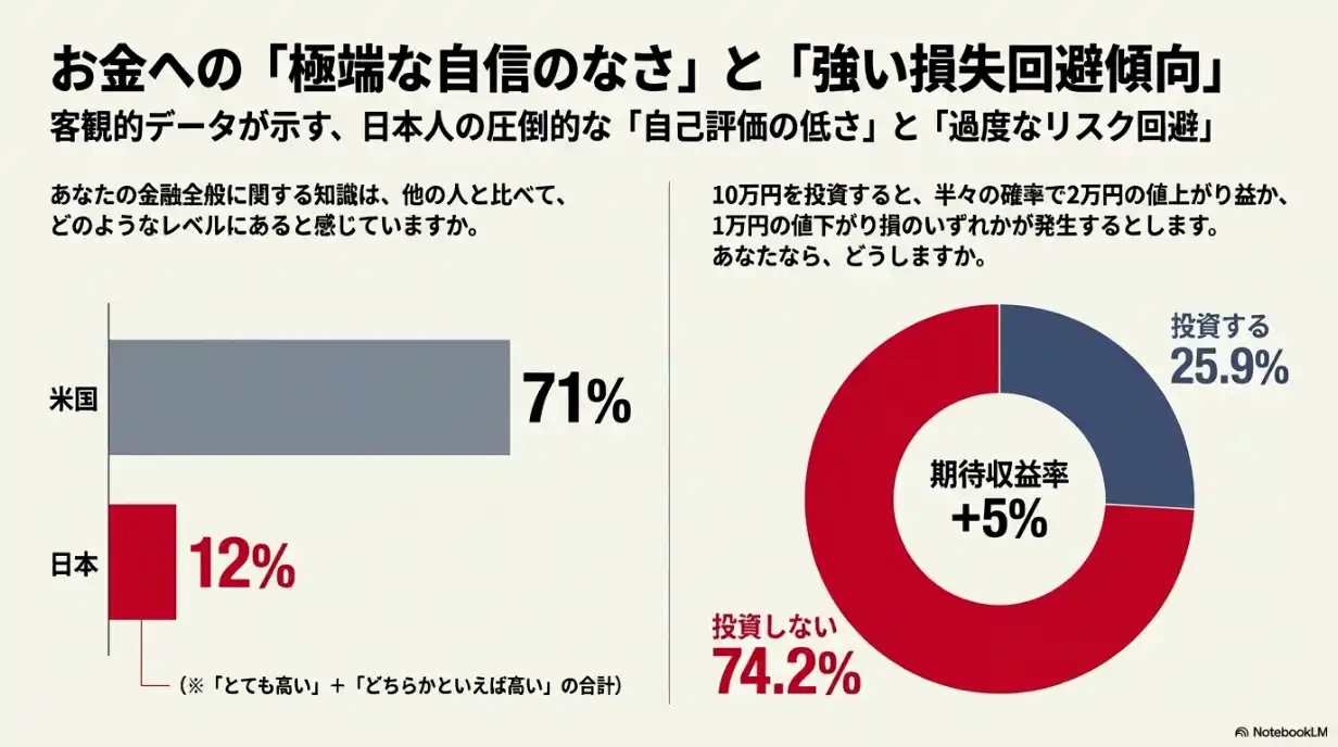 また、三大不安要素の「お金」については、金融広報中央委員会が2022年に行った調査において、日本人の圧倒的な「自己評価の低さ」と「過度なリスク回避」の傾向が見て取れます。 |