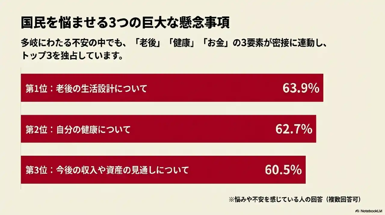 「老後」「健康」「お金(収入・資産)」が三大不安要素となっており、これらが密接に絡み合って国民の不安を形成していることがわかります。 |