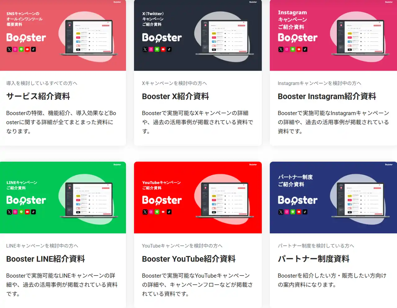 Boosterに関する全ての資料をまとめてご覧いただけます。X、 Instagram、LINE、YouTubeキャンペーンの詳細や、過去の 活用事例、導入効果、機能紹介など、SNSマーケティングに 役立つ情報を豊富に掲載しています。 |