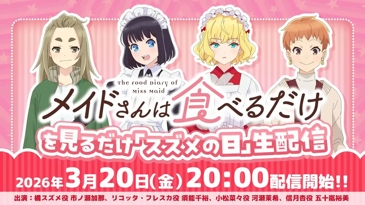 AnimeJapan 2026 dアニメストアブースにて「メイドさんは食べるだけ」スペシャルステージの実施が決定しました!!当日は、橘スズメ役 市ノ瀬加那さん、リコッタ・フレスカ役 須能千裕さんが登壇!! AnimeJapan 2026へお越しの際は、「メイドさんは食べるだけ」スペシャルステージもお見逃しなく!!またステージの様子は、dアニメストア公式YouTubeチャンネルでライブ配信も実施いたします!詳細はdアニメストアの特設ページや公式Xをご確認ください。 |