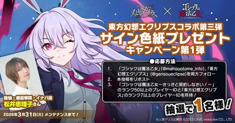 株式会社ケイブ(本社:東京都目黒区、代表取締役社長:高橋祐希、証券コード:3760)が配信中のシューティングゲームアプリ『ゴシックは魔法乙女~さっさと契約しなさい!~』(『ごまおつ』)におきまして、同社が提供するシューティングゲーム『東方幻想エクリプス』とのコラボイベント『波長を繋ぐ 幻想の魔門公』を本日3月10日(火)より開始いたしました。 |