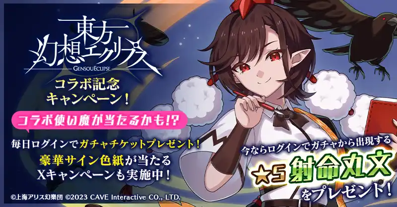 コラボイベント期間中にログインした全プレイヤーを対象に、『東方幻想エクリプス』コラボガチャから出現する使い魔である★5「射命丸文」がもらえるログインボーナスを開始いたしました。 |