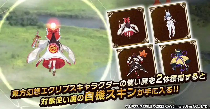 イベント開催期間中に東方幻想エクリプスの特定のキャラクター使い魔を2体獲得すると、対象キャラクターの自機スキンを手に入れることができます。 |