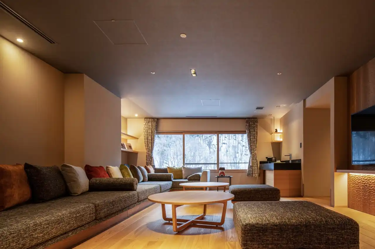 宿の顔であるロビーを、宿泊者全員が自由に、そして贅沢に過ごせる「フリーフロー・ラウンジ」へと昇華させました。チェックインの手続きを終えたその瞬間から、客室とはまた異なる開放感に満ちた「もう一つのリビング」として、思い思いの特等席でお過ごしいただけます。 |