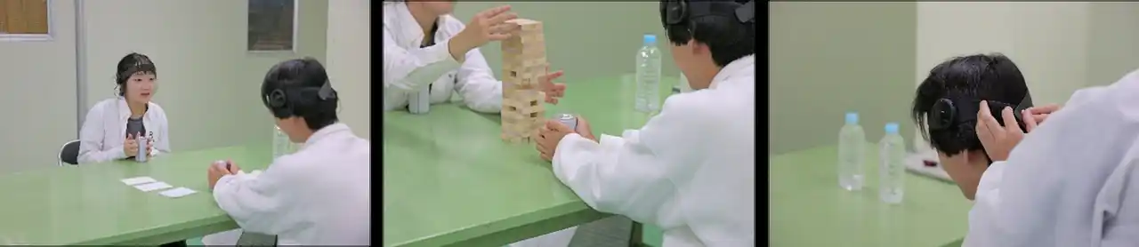 実験1.会話 温かいスチール缶を持つ、持たない両方のシチュエーションでの会話中とその前後の脳波計測を実施し、脳波からの感性値と事後アンケートの評価を実施。 実験2.作業 温かいスチール缶を持つ、持たない両方のシチュエーションでの共同作業として積み木を用いたタスク中とその前後の脳波計測を実施し、脳波からの感性値と事後アンケートの評価を実施。 |