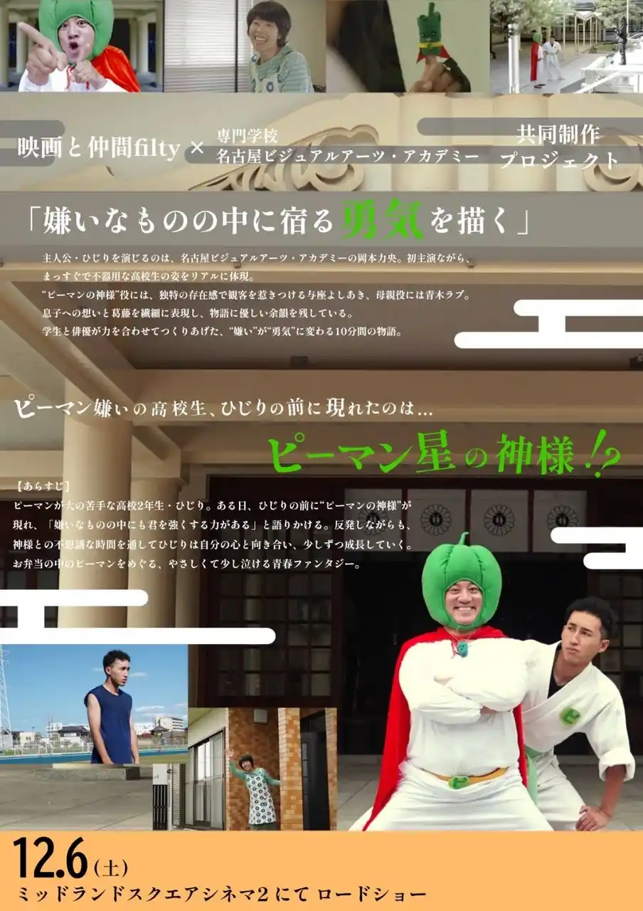 ピーマンが大の苦手な高校2年生・ひじり。ある日、ひじりの前に“ピーマンの神様”が現れ、「嫌いなものの中にも君を強くする力がある」と語りかける。反発しながらも、神様との不思議な時間を通してひじりは自分の心と向き合い、少しずつ成長していく──。 |