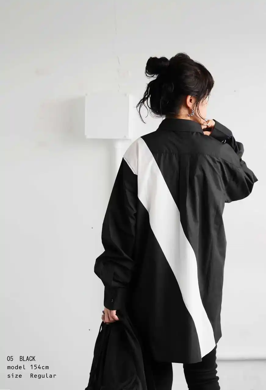 大胆な切り替えデザインが印象的な「TASUKI SHIRT」。 モードな雰囲気を感じさせるバイカラーデザインと、ゆったりとしたシルエットが特徴の一着です。 |