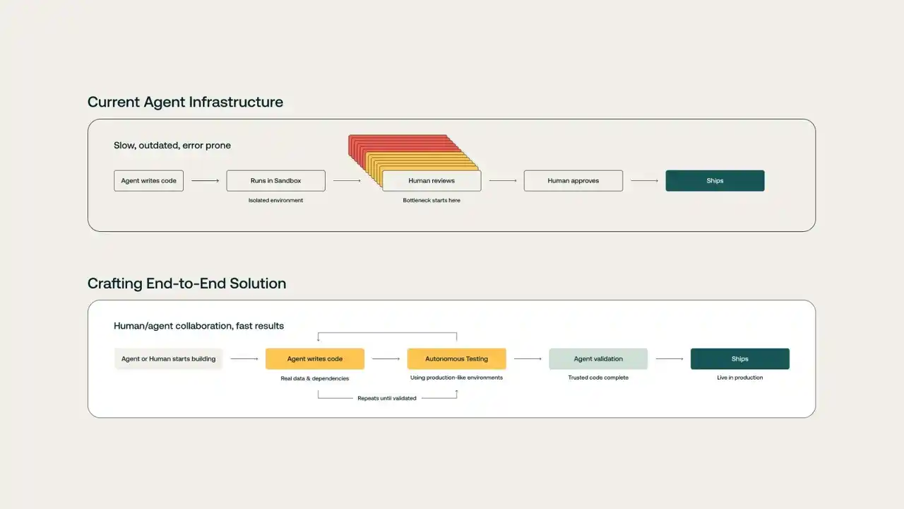 しかし、AIエージェントがプルリクエストを作成し、本番コードを書くようになっても、その内容を検証するためのインフラが追いついていません。エンタープライズのシステムはあまりに複雑でサンドボックス環境だけでは再現しきれず、最終的な確認や検証の段階でエンジニアがボトルネックになっているのが現状です。 |