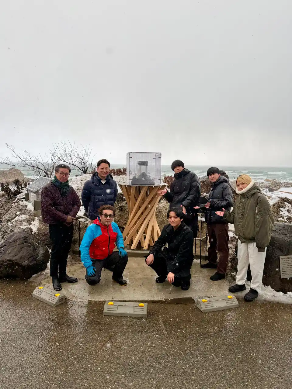 輪島市町野町曽々木にある「窓岩」は穴の開いた奇岩で、長年にわたり地域住民の心のよりどころとなってきましたが、2024年の震災で崩落し形が変わってしまいました。学生たちは2025年5月から設計を開始し、モニュメントの全体設計と「窓岩」の3Dオブジェクト設計を担当。オブジェを置く台はJR金沢駅の鼓門をオマージュし、地域文化への敬意と被災地への思いを込めてデザインしました。2026年2月1日、輪島市で点灯式が執り行われ、「希望の灯り」は能登へと受け継がれました。 |
