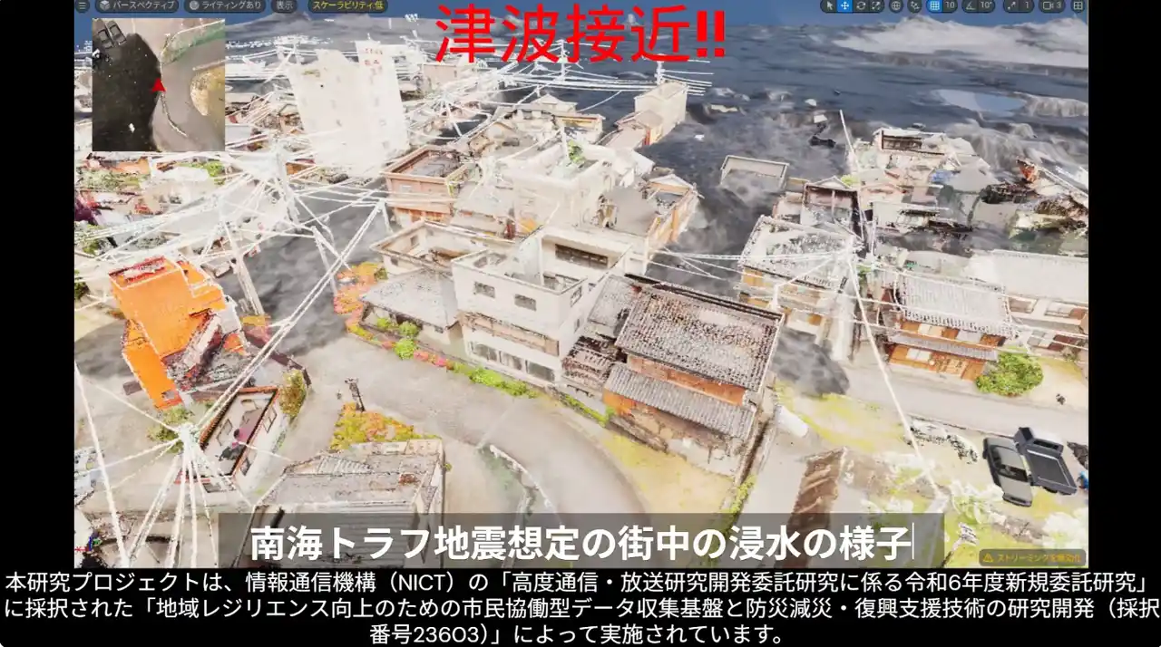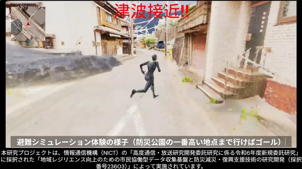 南海トラフ巨大地震による津波被害が現実の脅威として迫る中、総合情報学部情報学科の中原匡哉准教授は、VRゴーグルで体験できる「VR津波避難アプリ」を開発しました。徳島県の漁師町を忠実に再現した3Dデータを活用し、実際の街を歩くような感覚で複数の避難ルートを"体で覚える"ことができます。 |