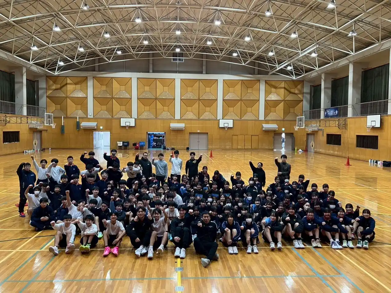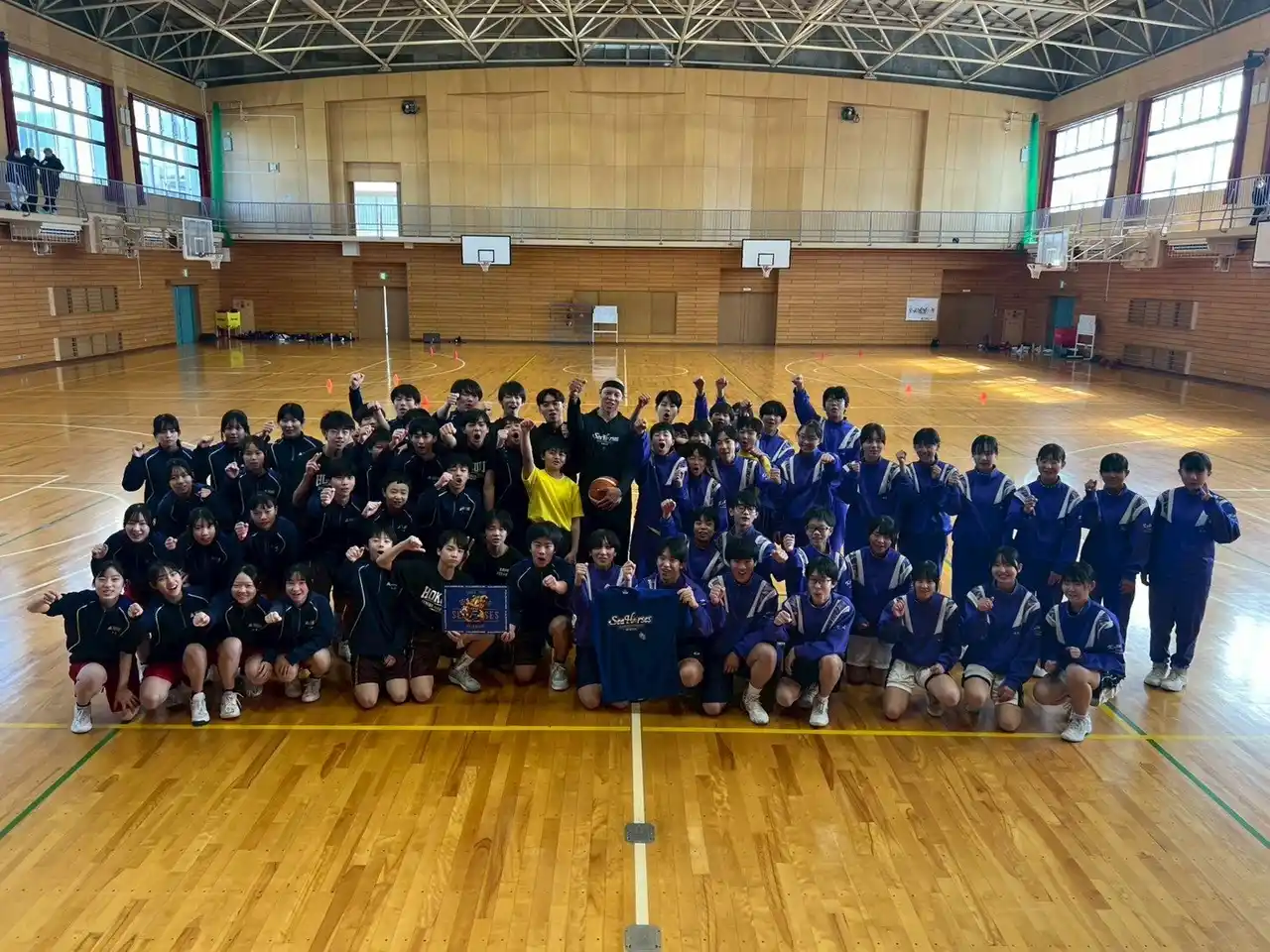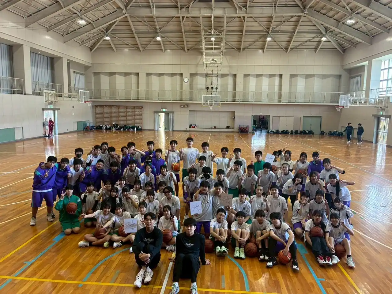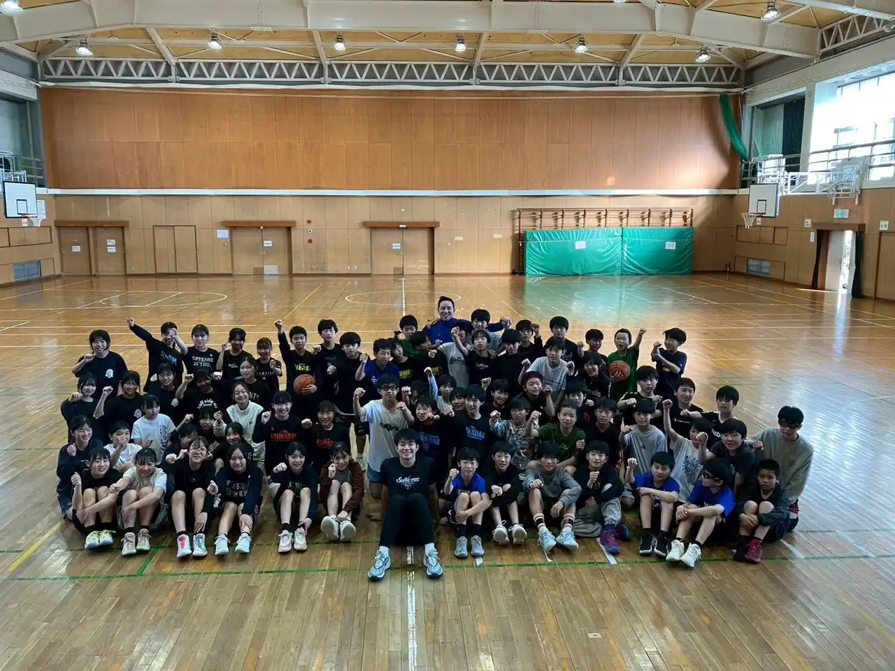 | 多くの子どもたちが参加し、選手やコーチとのふれあいを通じて、バスケットボールの基本動作やチームワークの大切さを学びながら、笑顔あふれる時間となりました。 | |||