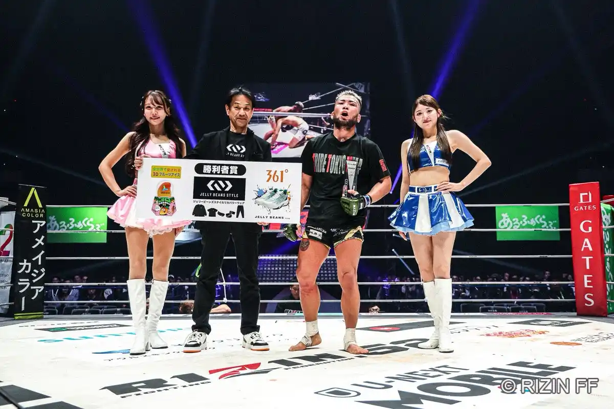 また、本大会ではジェリービーンズグループが大会協賛企業として参画し、当社代表取締役の宮崎明がリング上にて勝利者賞の授与を行いました。トップアスリートの活躍を称える場に参加できたことは、当社にとっても大変意義深い機会となりました。 |