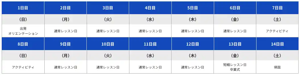 本キャンプは、14日間すべてを英語で過ごす“英語漬け”環境を軸に設計されています。授業だけでなく、生活・共同活動・アクティビティまで含め、英語を使う時間を最大化しています。 |