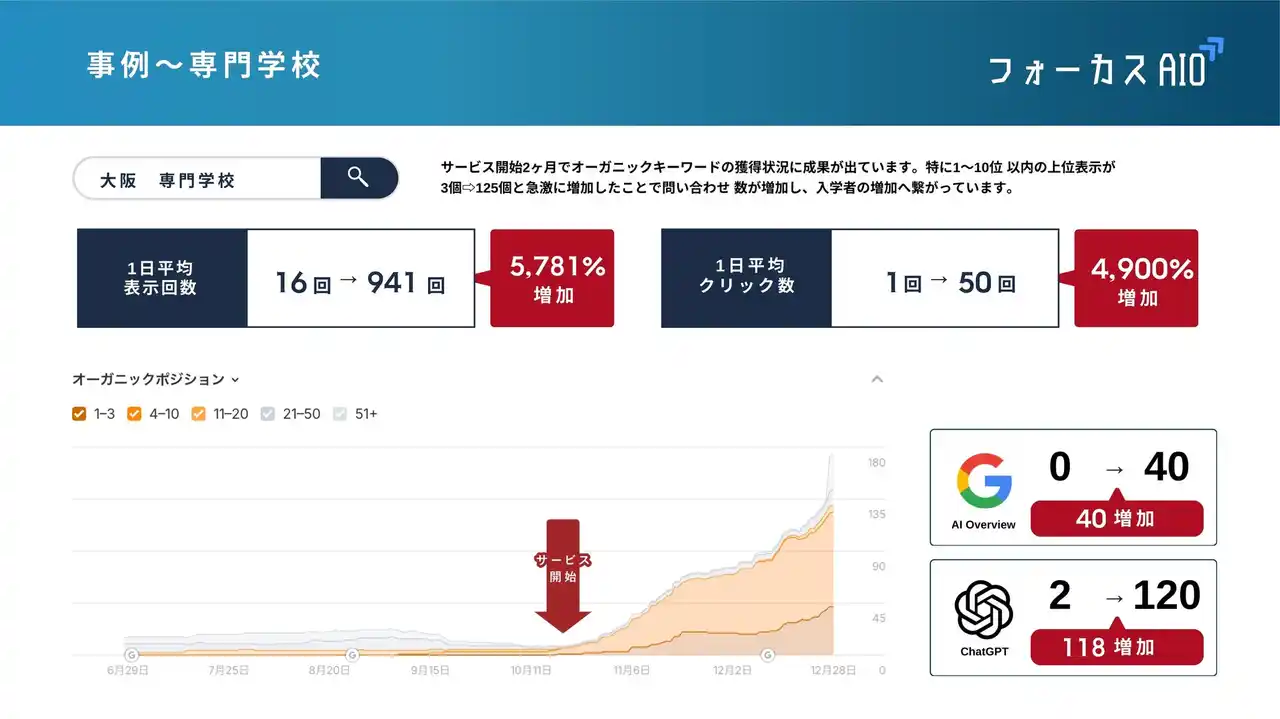 専門学校:AIによる推奨機会が増え、1日あたりの平均表示回数が16回から941回へと5,781%増加。 |