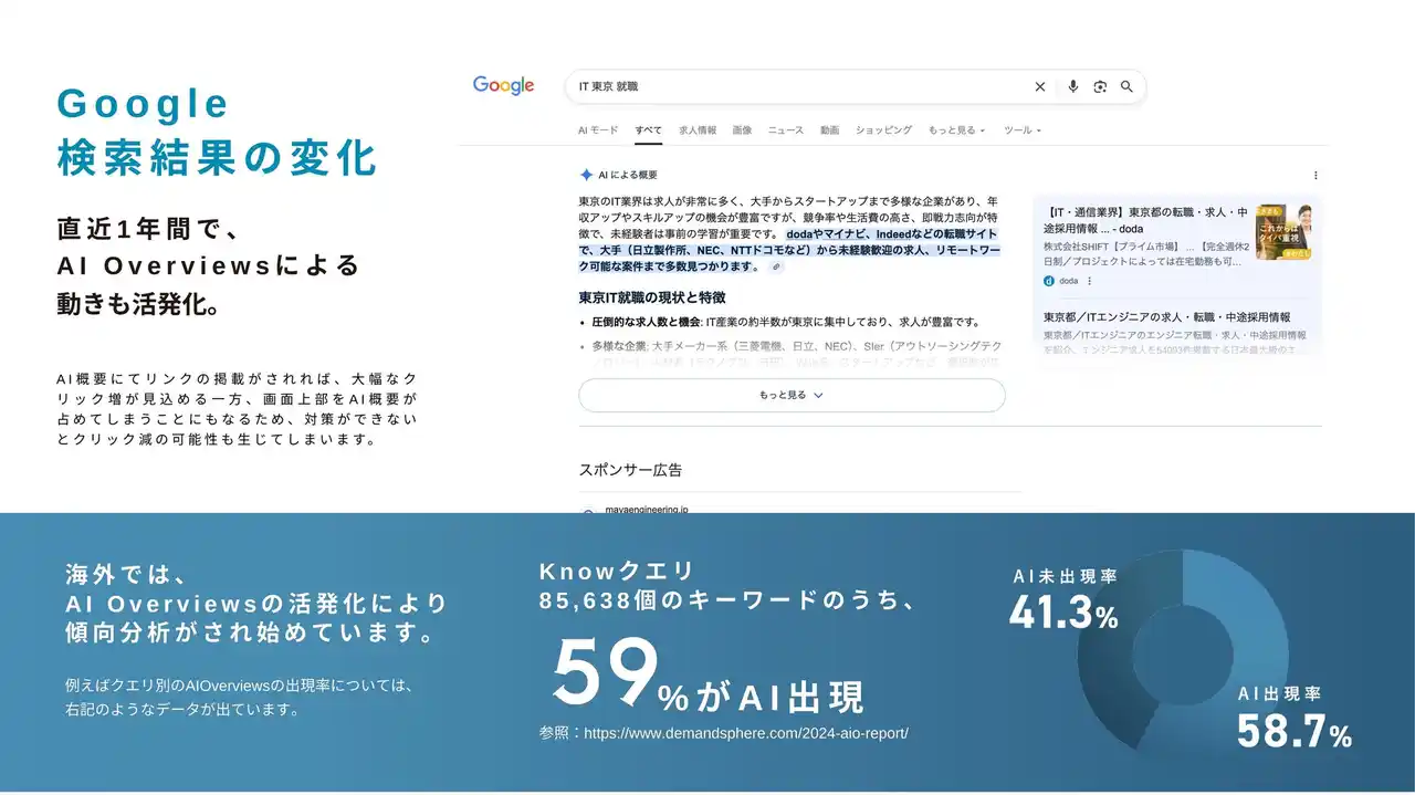現在、消費者の行動は「キーワードを打ち込んで店舗リストから探す」ことから、「AIにおすすめの店舗を尋ね、提案を受ける」ことへと劇的に変化しています。調査によれば、国内マーケターの61.9%が自然検索からの流入減少を実感しており、従来のMEOやSEO対策だけでは、AI時代のお店選びの土俵に乗ることが難しくなっています。 |
