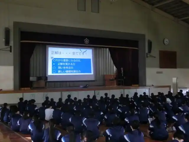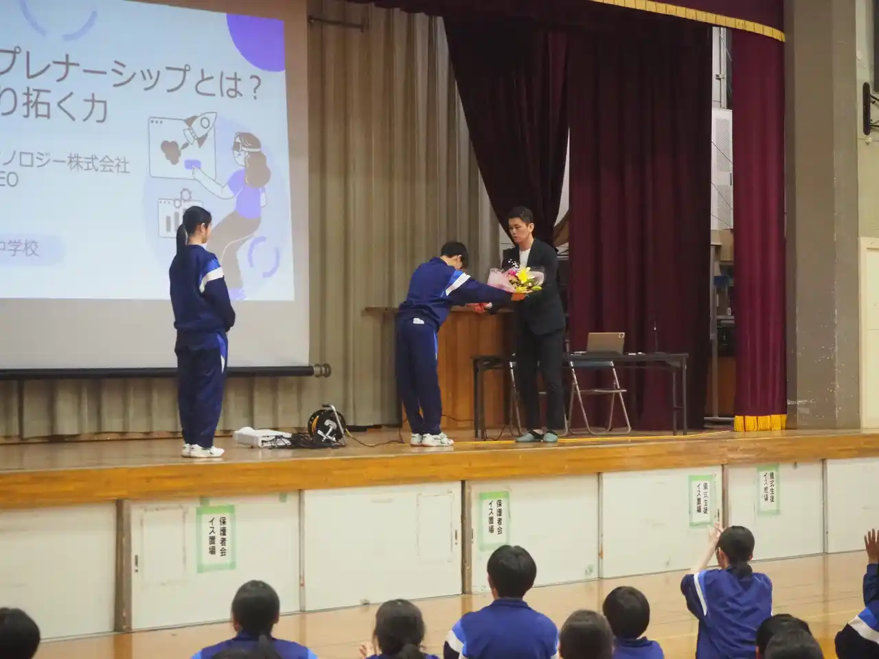 本講演は「アントレプレナーシップとは?未来を切り拓く力 」をテーマに、中学生が社会課題を自ら発見し、解決する視点を育むことを目的に行われました。 |