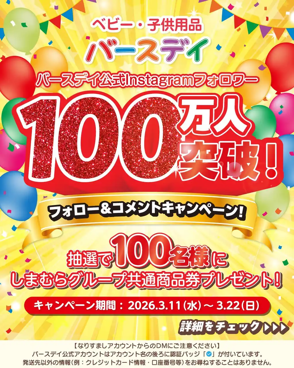 株式会社しまむら(本社所在地:埼玉県さいたま市大宮区北袋町1-602-1、代表取締役:高橋 維一郎)は、しまむらグループのベビー・子供用品『バースデイ』の、公式Instagramのフォロワーが100万人を突破したことを記念し、キャンペーンを実施することをお知らせいたします。 |