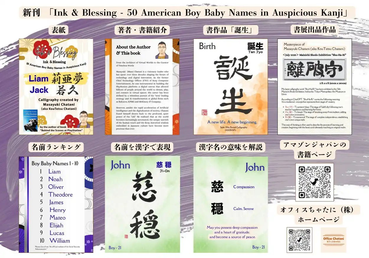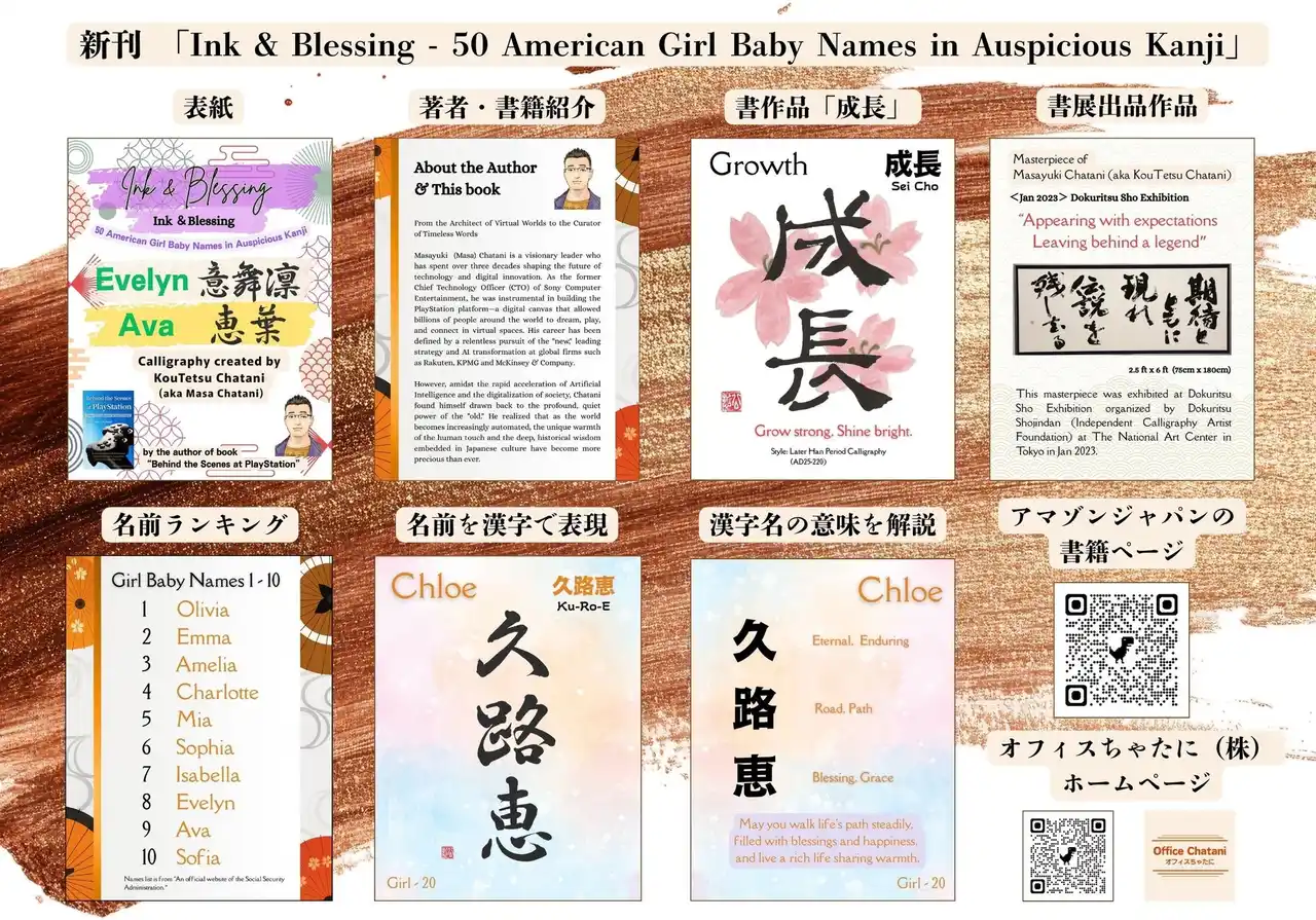 | オフィスちゃたに株式会社(代表取締役:茶谷公之)は、日本古来の文字文化である漢字を通して「名前に込められた意味と祝福」を再解釈した書籍「Ink & Blessing - 50 American Boy Baby Names in Auspicious Kanji」および「Ink & Blessing - 50 American Girl Baby Names in Auspicious Kanji」を、Amazonにて世界同時発売いたしました。 | |||||||||||||||||||