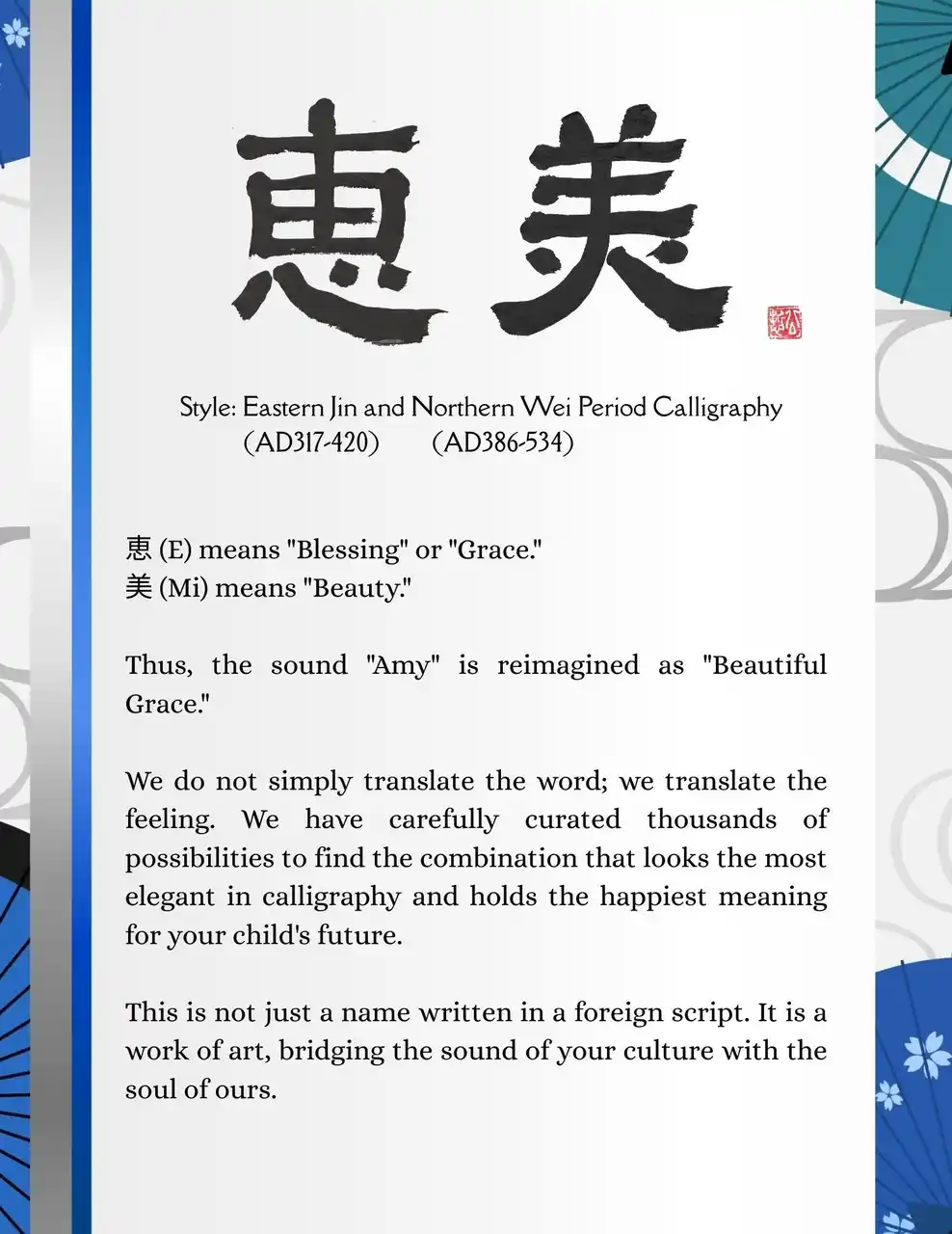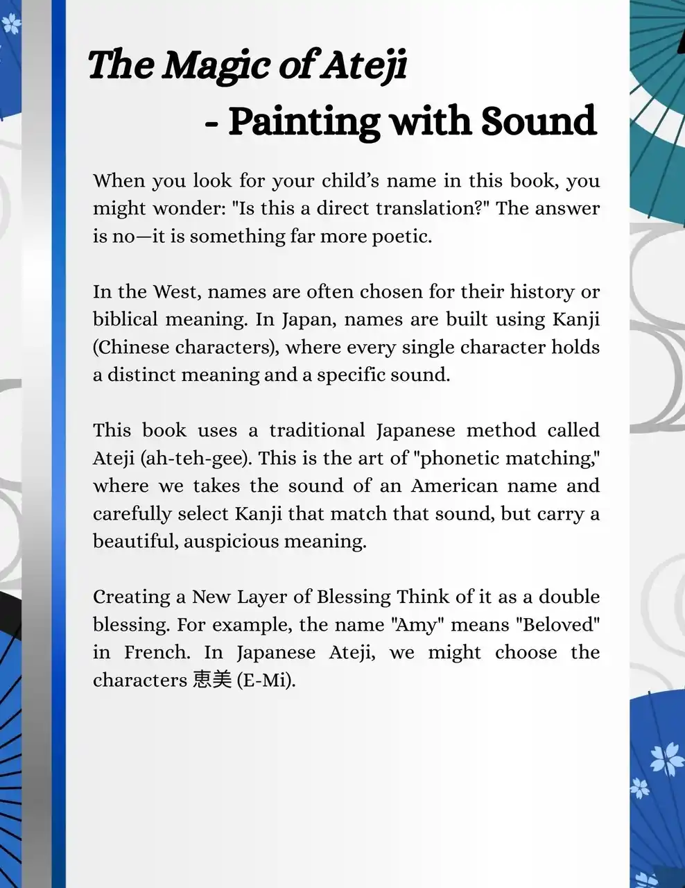 | 「例えば『Amy(エイミー)』という名。フランス語で『最愛の』を意味するこの響きに、本書では『恵美(E-Mi)』という漢字を割り当てました。これは『天の恵み(Blessing)』と『美しさ(Beauty)』が共にある人生を願うアプローチです。私たちは単に文字を訳しているのではなく、その名の深層に流れる『想い』を訳しているのです。 | |||||||||||||||||||