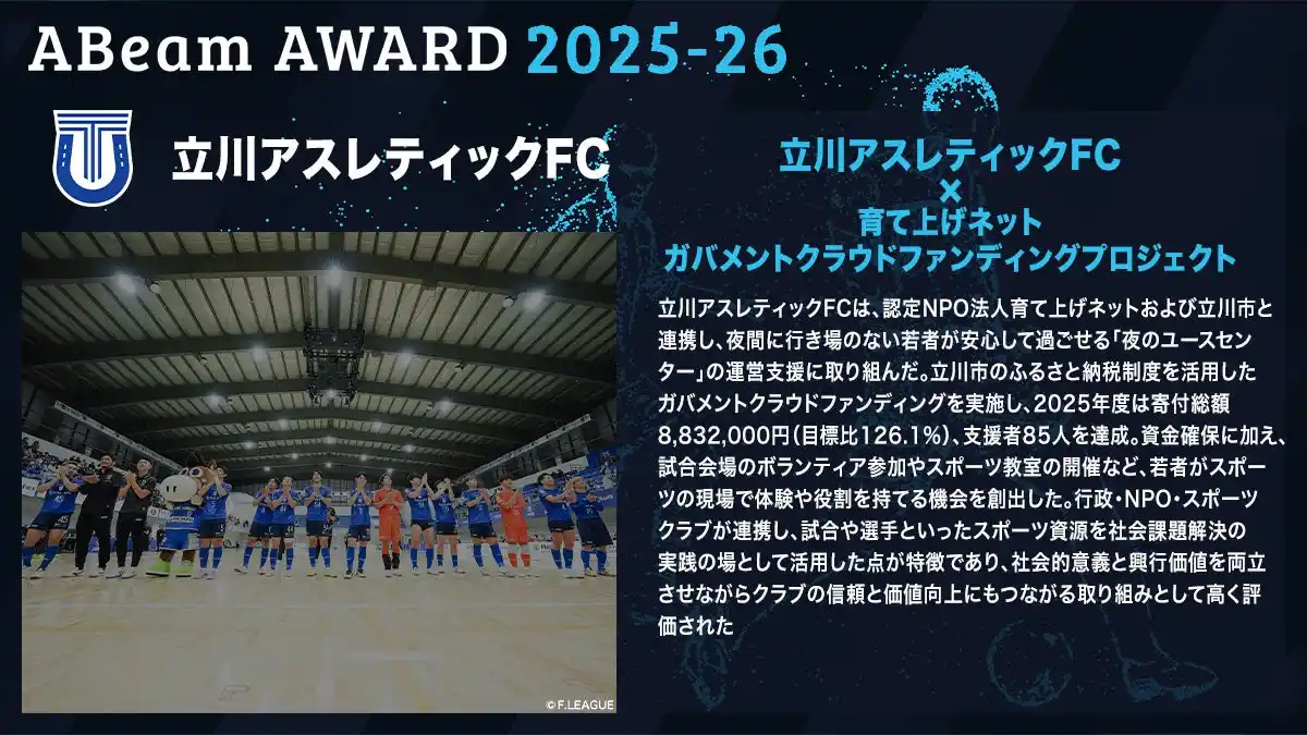 | 立川アスレティックFC(本拠地:東京都立川市)は、認定NPO法人育て上げネット(東京都立川市)および立川市と連携し実施した「ガバメントクラウドファンディングプロジェクト」が、Fリーグのオフィシャルスポンサーであるアビームコンサルティング株式会社が企画・運営する「ABeam AWARD 2025-26」において最優秀賞を受賞したことをお知らせいたします。 | |||||||||