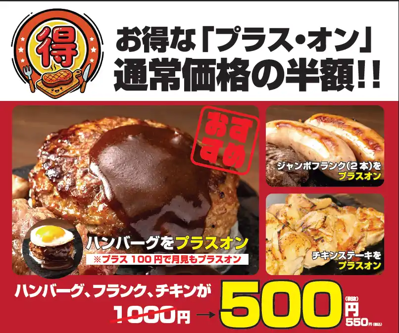 げんこつハンバーグ、ビックフランク(2本)、チキンステーキの3種の商品を、ステーキに追加する際に、通常の価格の半額でご提供!! ★げんこつハンバーグ 通常価格1000円 → 500円 → 平日ランチタイム限定300円 |