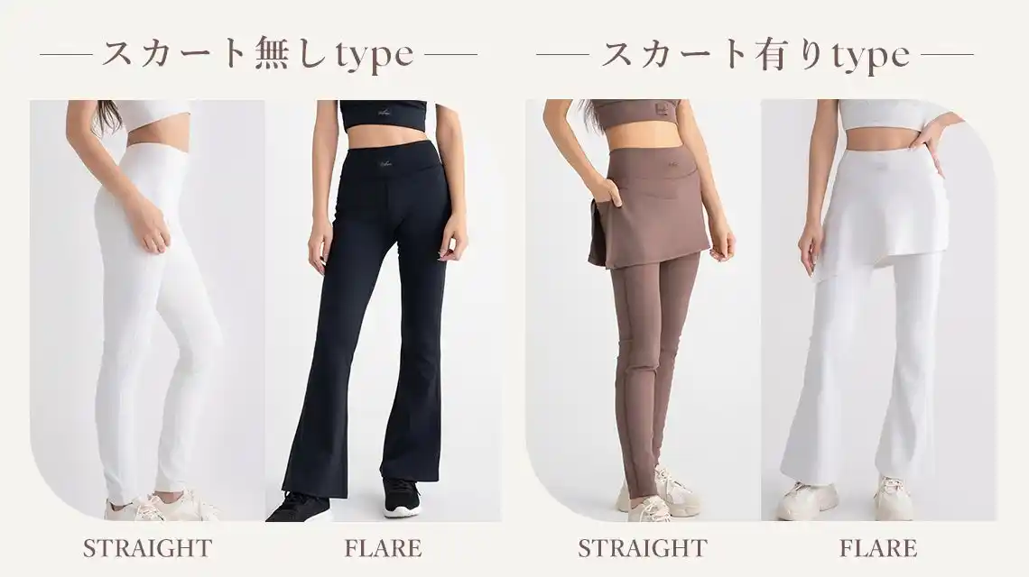ユーザーの体型や用途に合わせて、4つのシルエットから最適なボトムスを選べます。脚のラインを美しく見せるフレアシルエットや、ヒップラインをさりげなく隠すスカート付きタイプなど、フィットネスウェアに抵抗がある方でも挑戦しやすいラインナップです。また、全タイプにスマートフォンを収納できる隠しポケットを装備。ランニング時も身軽に動ける利便性を備えています。 |