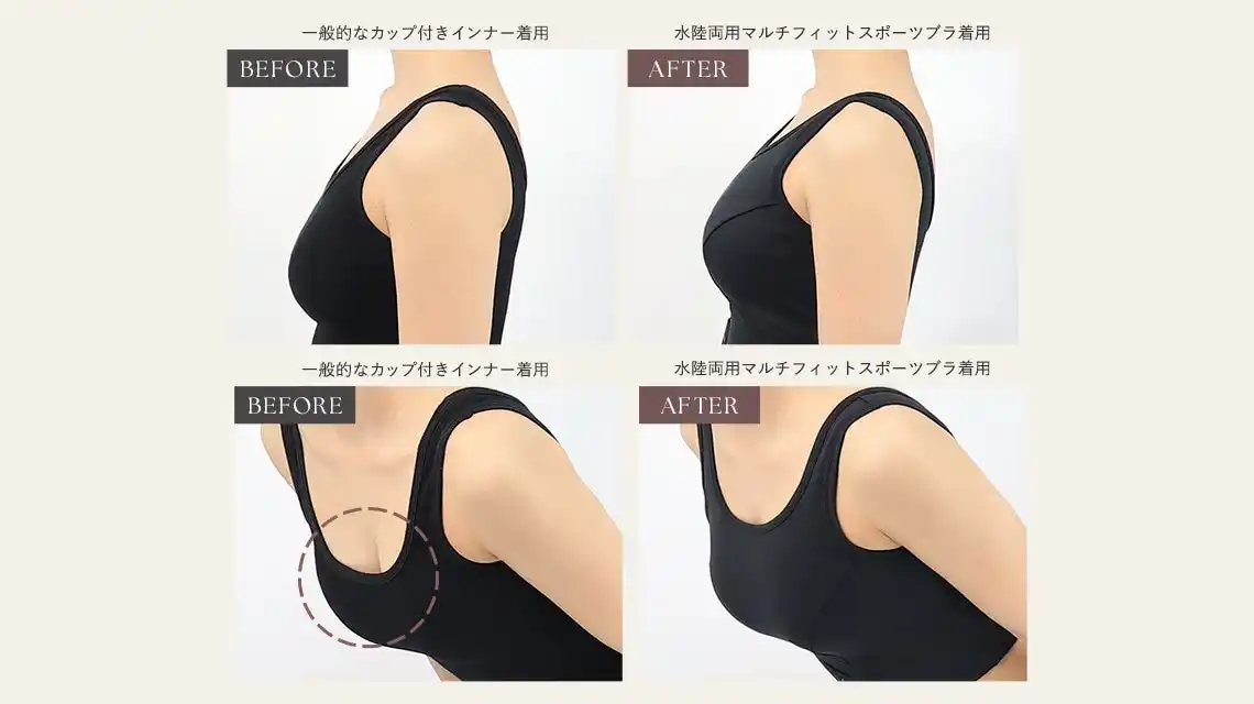 ■スポーツブラ特有の「バストの潰れ」という課題に終止符を 多くの女性がスポーツウェアに抱く不満として、「ホールド力を重視するとバストが平坦に見えてしまう」「水着をスポーツウェアとして代用すると安定感に欠ける」といった声が上がっていました。特にグラマーサイズの方にとって、揺れを抑えることと美しいシルエットを維持することは相反する課題でした。 水陸両用マルチフィットスポーツブラは、下着専門店として長年女性の体型に向き合ってきたtu-hacciの技術で、スポーツ時の激しい動きからバストを守りつつ、女性らしい立体的なデコルテラインをキープできる設計を追求しました。 |