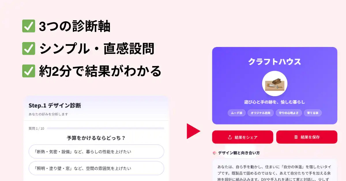 | マイホムでは、「マイホームタイプ診断」を通じて、家づくりにおける“なんとなくの迷い”を言語化し、意思決定を前に進める体験をつくることを目指しています。 | |||||||||||||||||