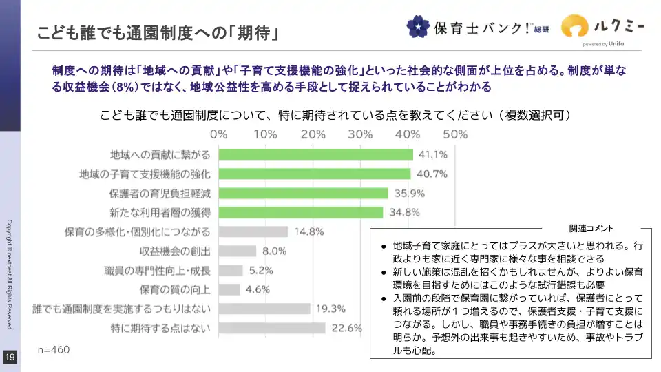 ・先行して試行的事業を実施している施設では「期待派(非常に期待・どちらかというと期待)」が約38%(38.3%)に達し、未実施園(12.6%)の約3倍という結果に。実際に運用を経験することで地域貢献への手応えを感じ、前向きに捉える施設が多い傾向にある。