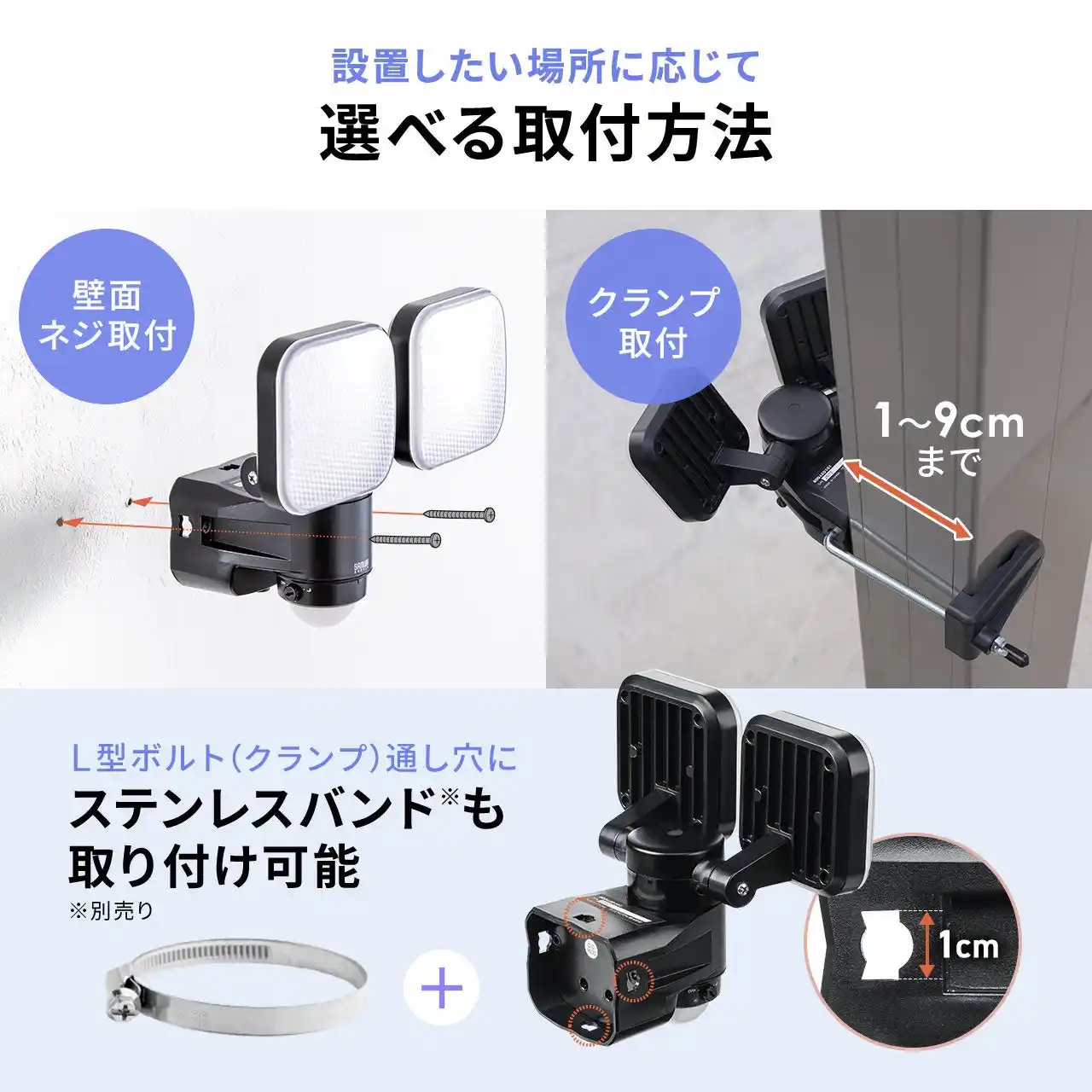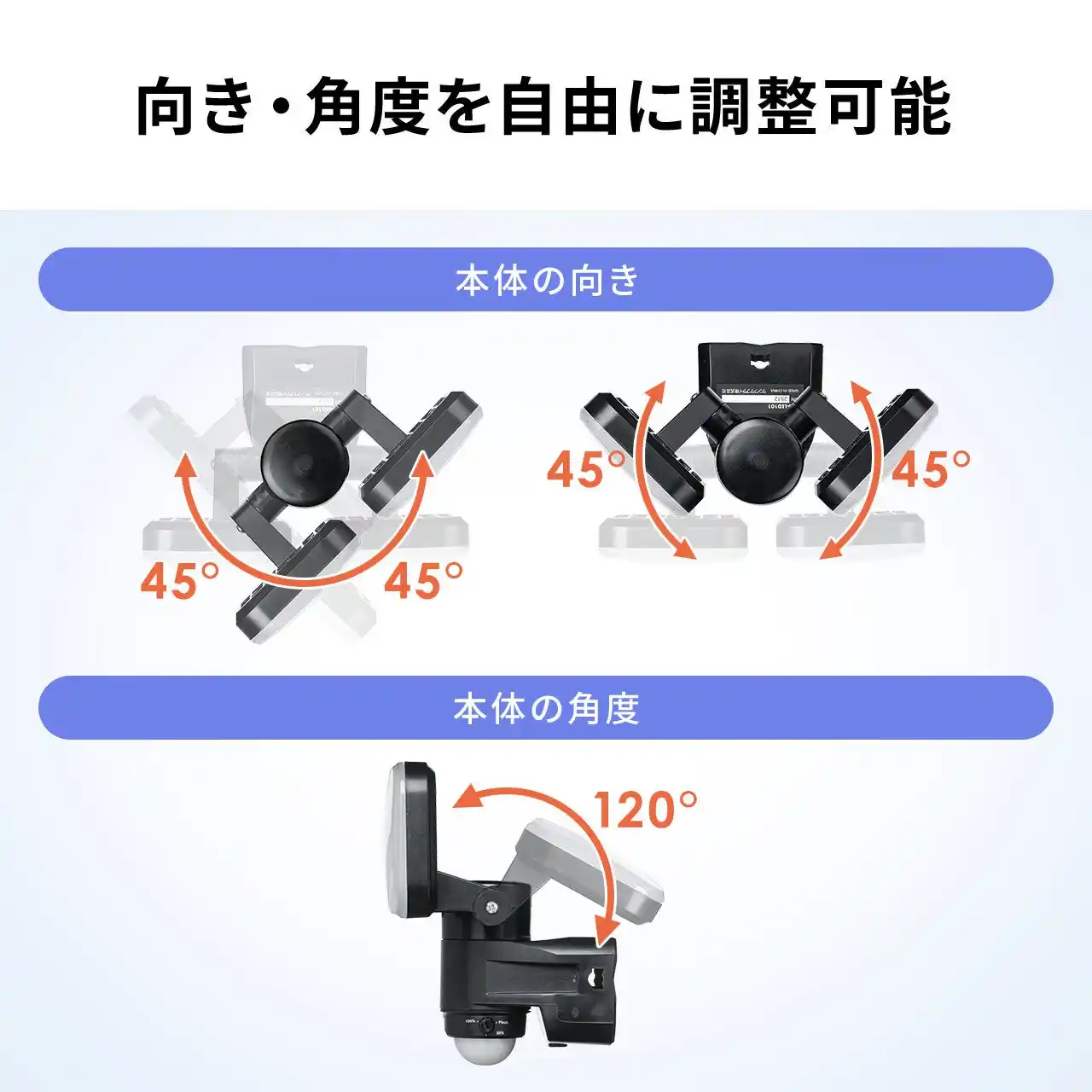 | 左右のライトとセンサーは可動式のため、照らしたい方向に合わせて角度調整が可能です。広く照らしたい玄関先から、狙った場所を照射したい通路や出入口まで、設置環境に合わせた使い方ができます。さらに、壁面へのネジ固定に加え、クランプでの設置にも対応。防水仕様で屋外でも使いやすく、家庭から店舗まで幅広いシーンで活躍します。 | |||||||||