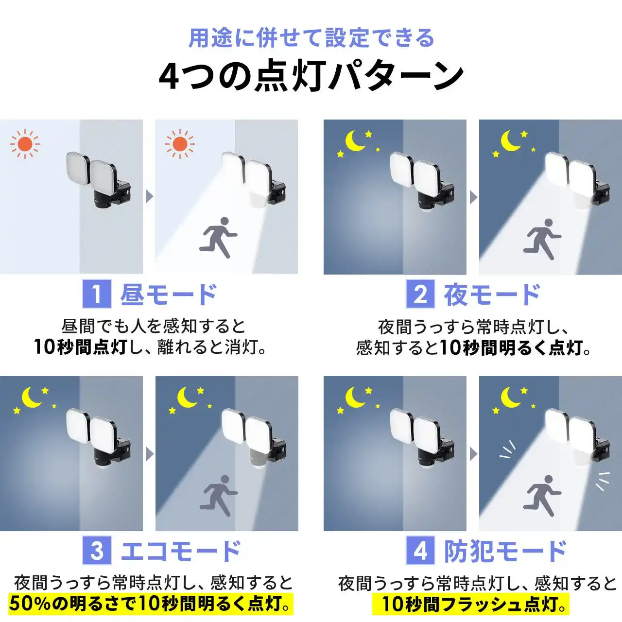 | 使用シーンに応じて選べる4種類の点灯パターンを搭載。帰宅時に人を感知して明るく点灯させたい場合や、夜間の見守りを重視したい場合など、目的に合わせた設定ができます。さらに、人感センサーによる自動点灯に加え、フラッシュ点灯を活用した防犯対策にも対応。暮らしの安心を支えながら、バッテリーの無駄な消費も抑えられます。 | |||||||||