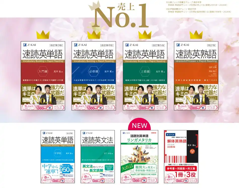 新しい教科書や参考書を揃える春。「今年は英語を頑張ろう!」と決意を新たにする人も多いのではないでしょうか。 Z会では、皆様の学習へのモチベーションをさらに高めていただきたいという想いから、「春の英語力UPキャンペーン」を実施します。キャンペーン帯が巻かれたZ会の書籍を購入いただいた方の中から、抽選で200名様に図書カードNEXT1,000円分をプレゼント。この春に手にした一冊が、皆さまの未来を切り拓くパートナーとなることを願っています。 |