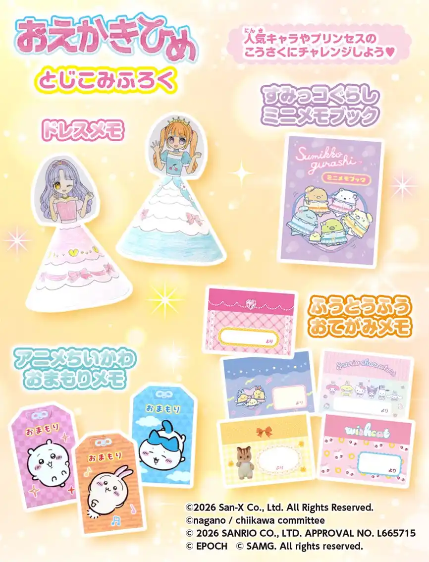 とじこみ付録も超豪華! 「すみっコぐらし ミニメモブック」や「アニメちいかわ おまもりメモ」 、さらに「ドレスメモ」や「ふうとうふうおてがみメモ」など、本誌でしか手に入らない特別なデザインのアイテムがいっぱいです。シールも充実しており、ドレスのきせかえ遊びを楽しめるページや、パッドのスタンドをデコレーションできるシールなど、遊びの幅が広がります。 |