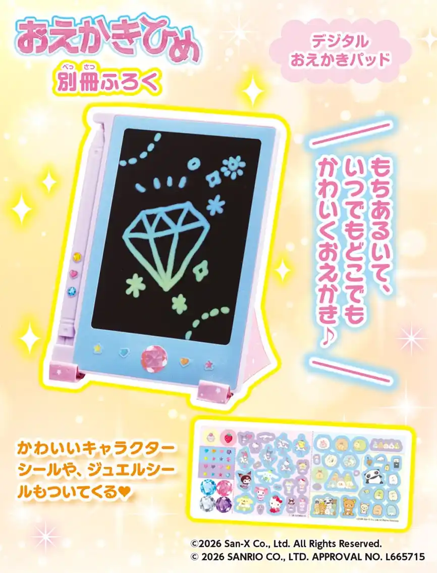 『おえかきひめ 2026年4月号』の別冊付録は「デジタルおえかきパッド」。専用ペンでパッドをなぞると、美しいグラデーションカラーの線や文字が描ける魔法のようなアイテムです。描いたものを消したいときは下のボタンを押すだけで一瞬で消去でき、何度でも繰り返しおえかきが楽しめます。また、裏面のロックスイッチをスライドすれば、描いた作品を保存しておくことも可能です。さらに、とじこみ付録の「デジタルおえかきパッドスタンド」を組み立てれば、パッドを立てたり飾ったりすることができます。 |