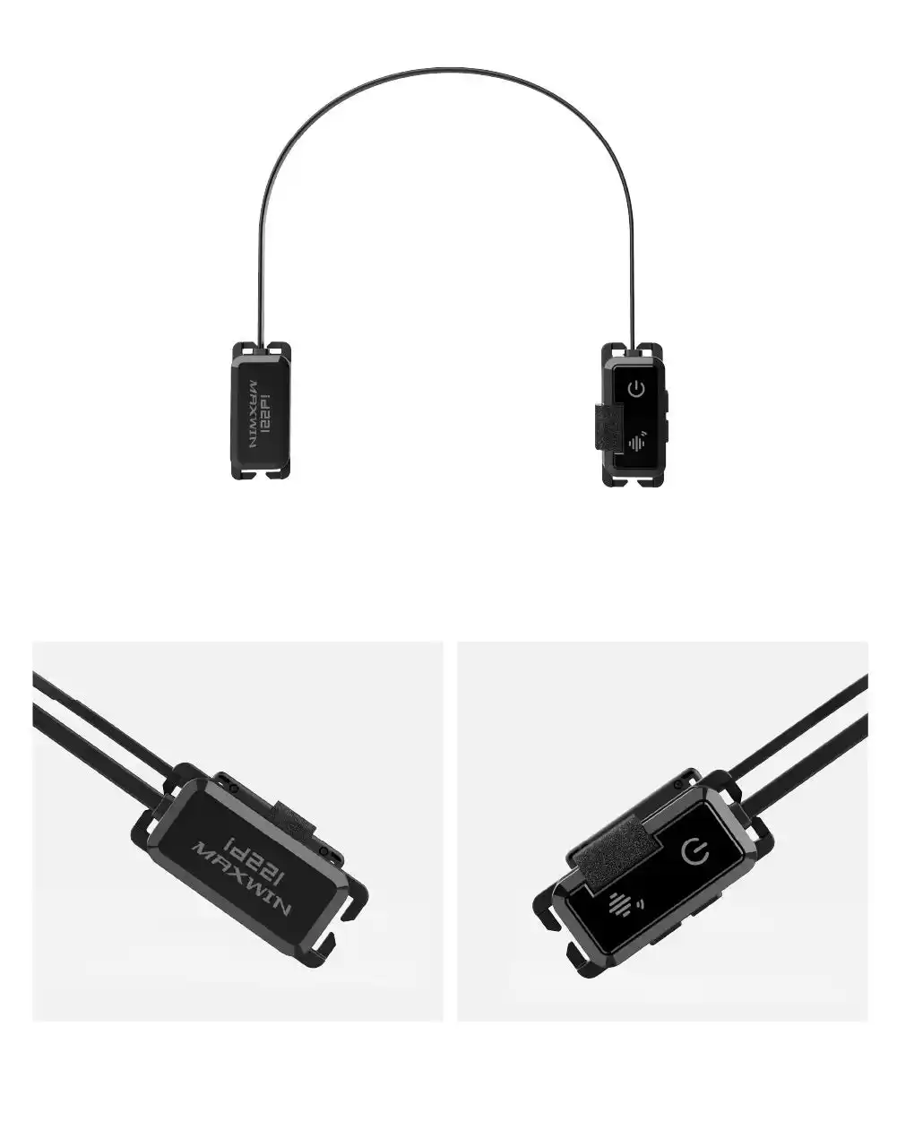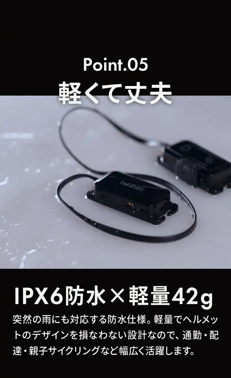 コンパクト&軽量設計・取付簡単 コンパクトかつ軽量設計で、様々なヘルメットやキャップのストラップ(幅 最大18mm)に違和感なく簡単に装着できます。薄く細いケーブルで配線もスッキリ。 |