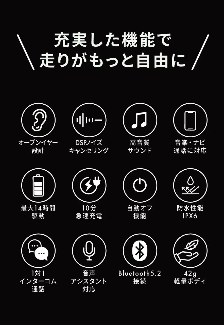 DSPアンプ搭載。オープンイヤーでも音楽や通話などを高音質に 風切り音を最大限カットするDSPアンプを搭載することで、ワイヤレスながらも高音質を追求。ノイズ・エコーキャンセラー搭載で通話中のノイズが軽減し、クリアな通話ができます。 |