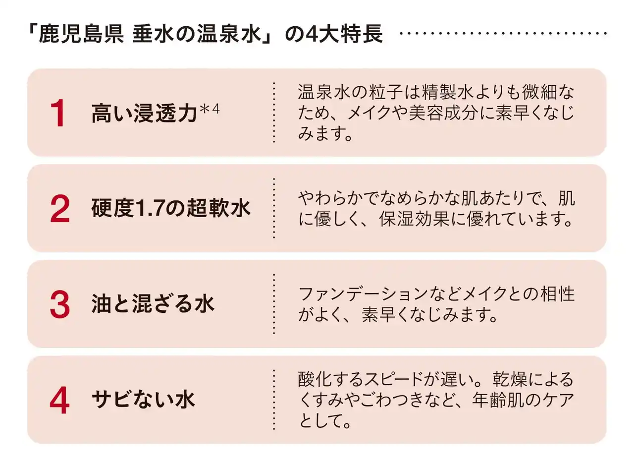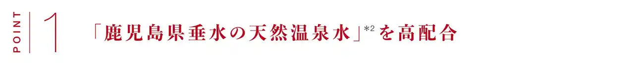 鹿児島県・垂水の大地が育んだ、澄み渡るようにやわらかな天然温泉水を採用。桜島火山帯地下750mという水源から湧き出す水は、pH 9.9・硬度2以下という高品質の天然水で、まさに自然が生んだ「天然の高機能水」です。 |