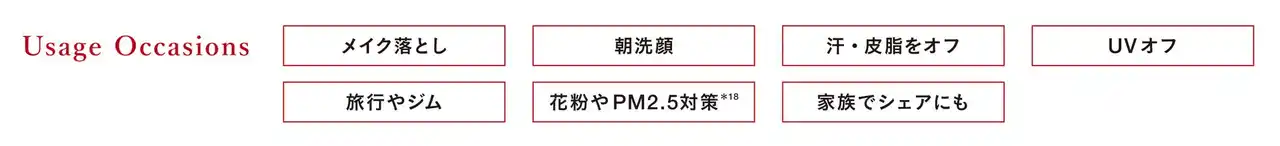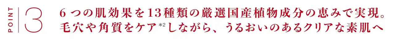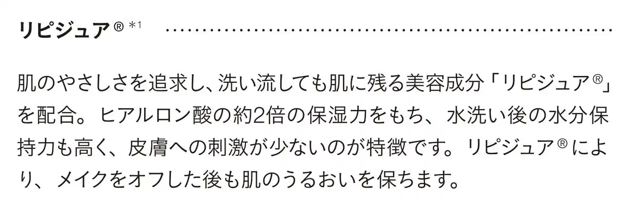 *1 ポリクオタニウム-51<保湿成分> リピジュアは日油株式会社の登録商標です *2 肌のキメを整えること *3 乾燥による *4 うるおいによる *5 ウメ果実エキス *6 シイクワシャー果皮エキス *7 ユキノシタエキス *8 マグワ根皮エキス *9 オリーブ葉エキス *10 セイヨウミザクラ果実エキス *11 ハトムギ種子エキス *12 ウンシュウミカン果皮エキス *13 イチョウ葉エキス *14 ミツバアケビ茎エキス *15 アロエベラ葉エキス *16 ヨモギ葉エキス *17 チャ葉エキス *18 肌に付着した花粉やPM2.5をふき取ること |