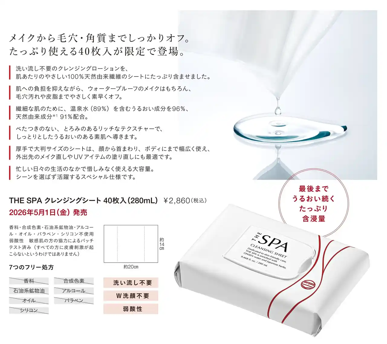 「肌へのやさしさ」と「機能性」を融合させた自然派化粧品を企画販売する江原道(こうげんどう)株式会社(本社:東京都品川区、代表取締役社長:板橋信太郎)は、メイク落としから毛穴・角質ケアまでマルチに使える大容量「THE SPAクレンジングシート40枚入」を、2026年5月1日(金)より数量限定で発売いたします。厚手で大判サイズのシートは、顔だけでなく首まわりやボディにも使用でき、外出先でのメイク直しやUVアイテムの塗り直しにも便利。日常のあらゆるシーンで活躍するスペシャル仕様のアイテムです。 |