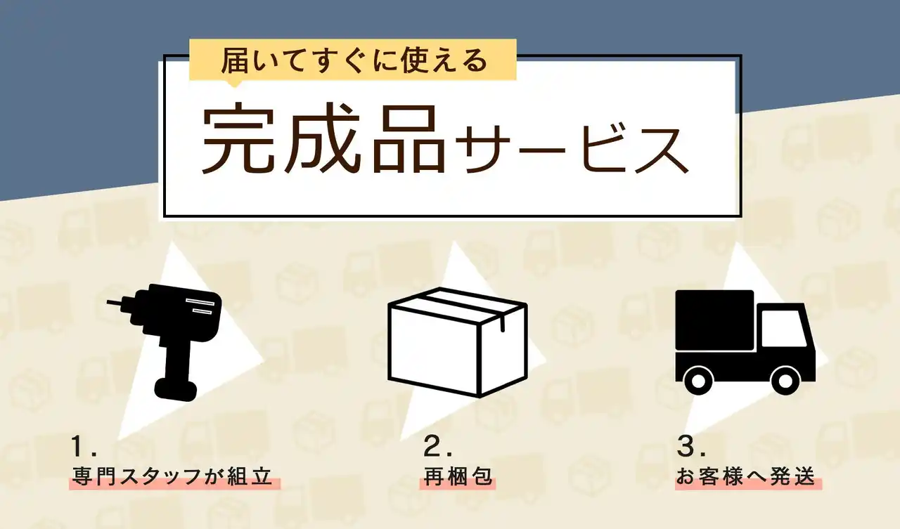 「家具の組み立てが大変」「組み立てる人手が足りない」といった声に応え、自社工場内で専門スタッフが家具の組み立てをおこない、完成した状態で指定の納品場所へお届けします。 |