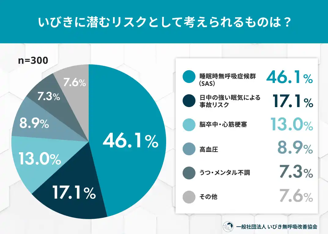 いびきに潜む疾患リスクの認知、SASの認知は高い(46.1%)が、脳卒中(13.0%)や糖尿病(4.1%)との関連を知る人は極めて少ない